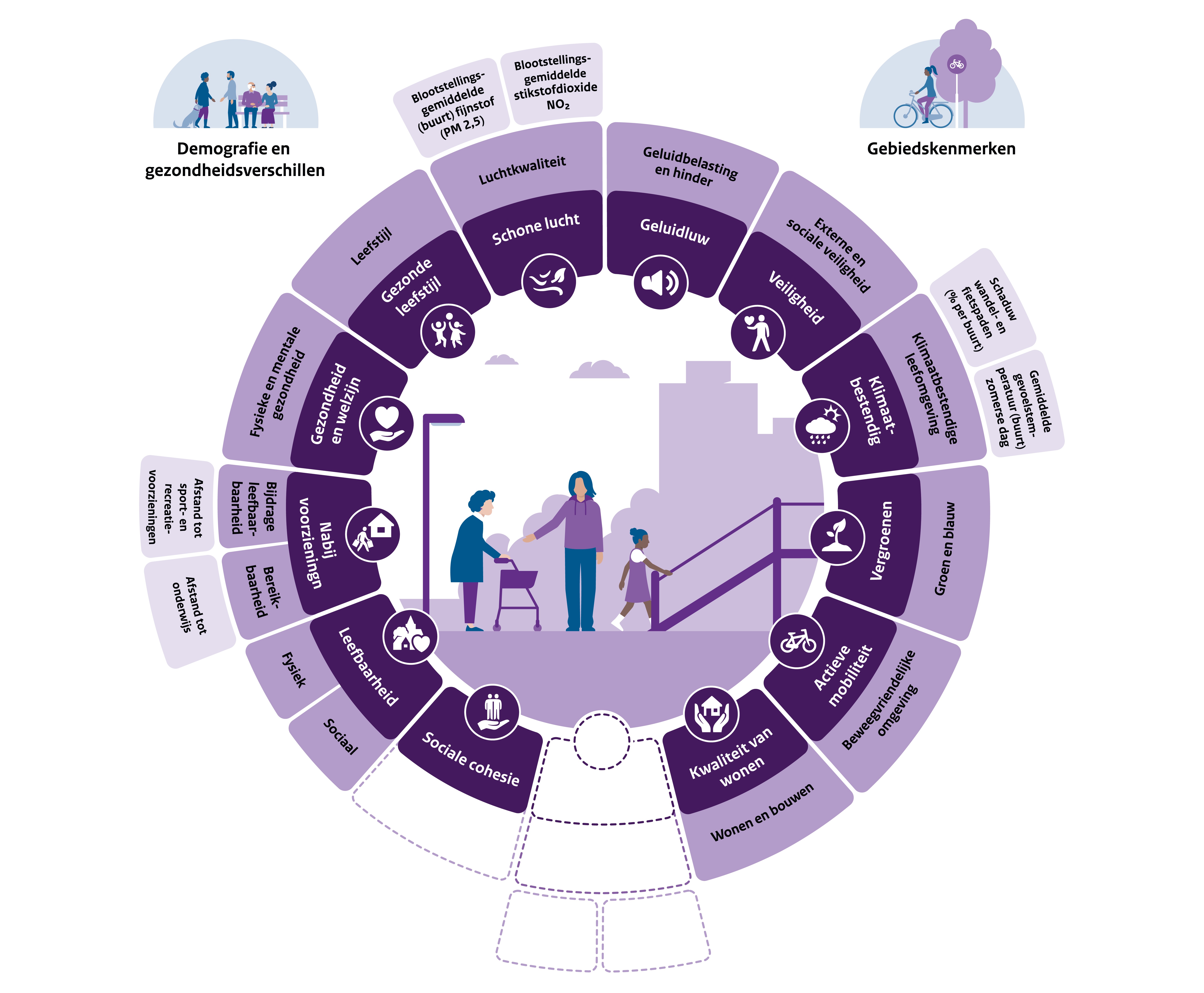 Gebiedscheck is een applicatie die snel inzicht biedt in de leefomgeving, gezondheid en bevolking van een gemeente, wijk of buurt in Nederland. Je kunt data en/of kaarten bekijken. De thema’s die in de Gebiedscheck aan bod komen staan in de onderstaande infographic.
